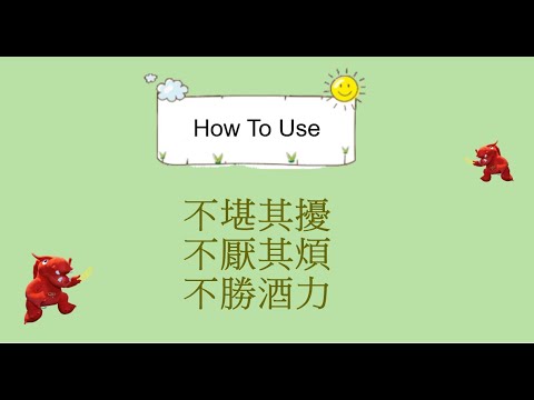 - 解釋:It literally means that one cannot overcome the power of alcohol. However, it doesn't refer to alcohol addiction; rather, it refers to drinking beyond one's limit and being unable to continue. It can also refer to having a low tolerance for alcohol and getting drunk easily.